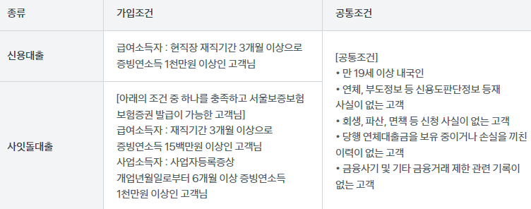 대출기간은 위와 같으며 신용대출은 만기일시상환 또는 원리금균등분할상환방법을 선택이 가능하며 사잇돌대출의 경우 원리금균등분할상환 선택만 가능합니다.