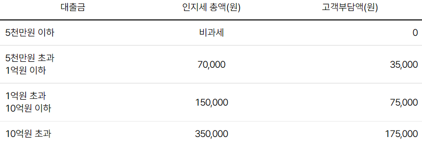 인지세란 대출 거래 신규 약정 시 내는 세금으로 인지세는 대출금액에 따라 아래와 같이 차등 적용되며 이 인지세는 은행과 고객이 각각 50%씩 부담하게 됩니다.