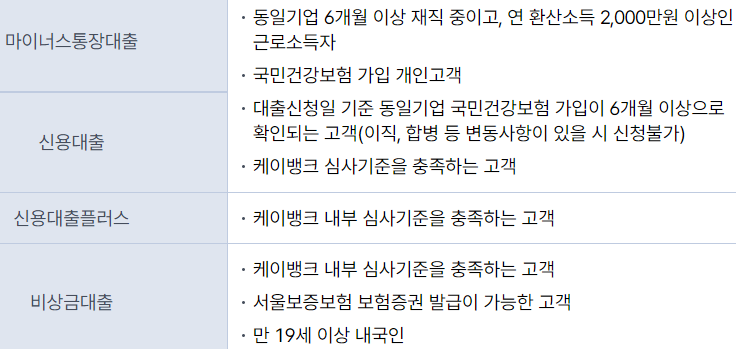 위 상품별로 대출 자격 조건은 아래와 같습니다.