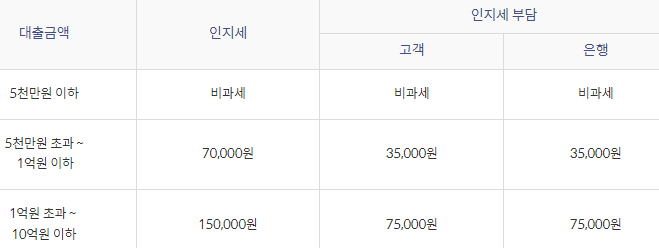 인지세란 대출을 받기 위해 맺는 계약인 대출 거래약정에 따라 납부하는 세금으로 대출금액에 따라 세금은 위와 같이 차등 적용됩니다.