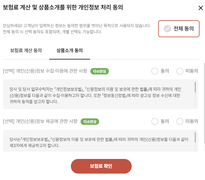 보험료 계산을 위한 개인정보 처리 동의를 클릭합니다.
