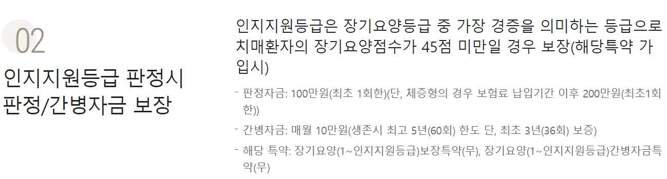 치매는 CDR 척도나 장기요양등급에 따라 경증, 중증으로 구분됩니다. 경증 치매는 주로 기억력이 약간 저하되거나 일상생활에 미미한 영향을 주는 정도이고, 중증 치매는 인지기능이 심하게 저하되어 독립적인 생활이 어려운 정도입니다. 보험사마다 보장 기준이 다르므로, 경증 치매에 대해서도 보장이 되는지 확인해야 합니다. 일부 상품은 경증 치매 진단 시 진단자금을 지급해주거나, 장기요양등급 4~5등급에 해당하는 경우에도 간병비를 지급해주는 경우가 있습니다.
