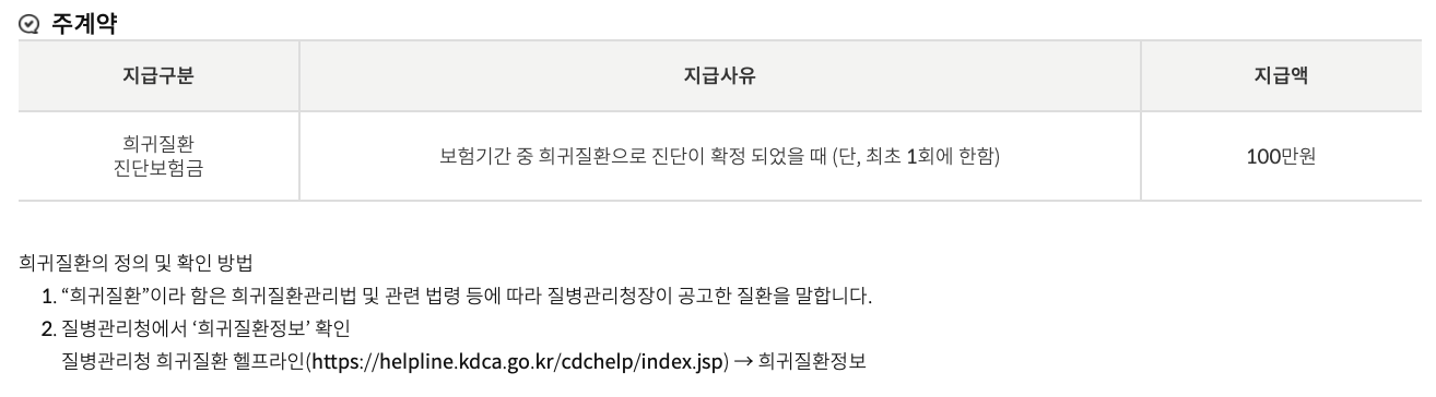 태아가 질병관리청에서 지정한 1165개 희귀질환으로 진단 확정받았을 때, 1회 100만원의 보험금을 지급합니다.