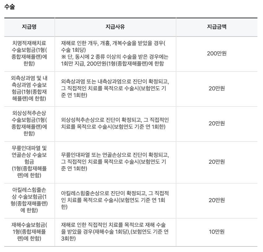 | 재해상해수술비 | 보험료 납입 기간 중 피보험자가 재해로 수술을 받은 경우, 수술비를 지급한다. |