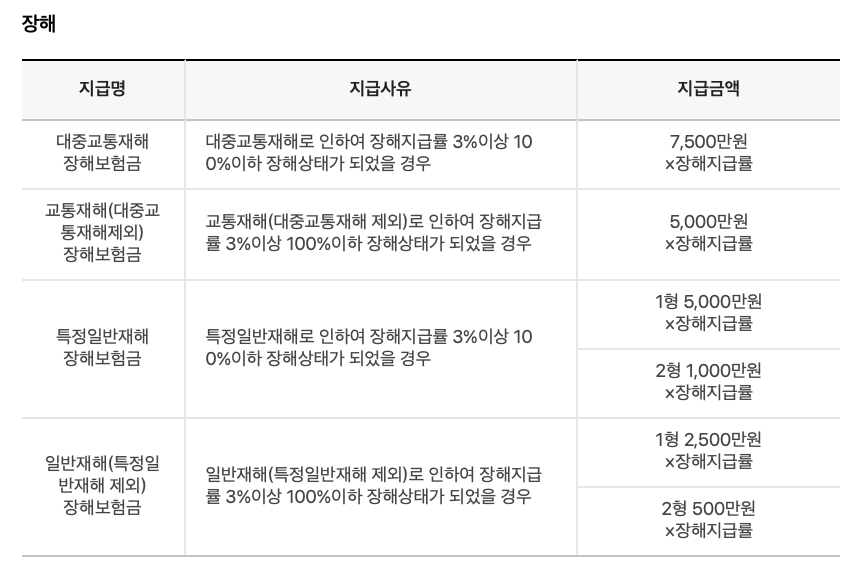 | 재해후유장해보장 | 보험료 납입 기간 중 피보험자가 재해로 후유장해를 입은 경우, 후유장해등급에 따라 보험금을 지급한다. |