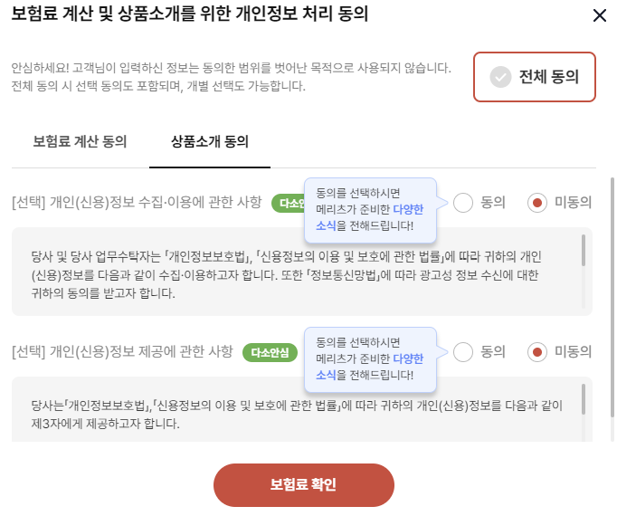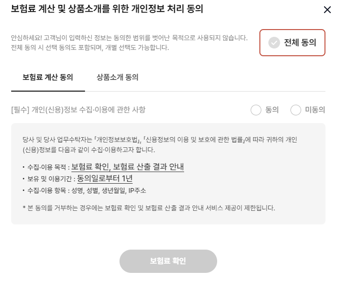 상품 소개를 위한 정보는 선택 동의 이기 때문에 꼭 동의하지 않으셔도 되며 보험료 확인을 클릭합니다.