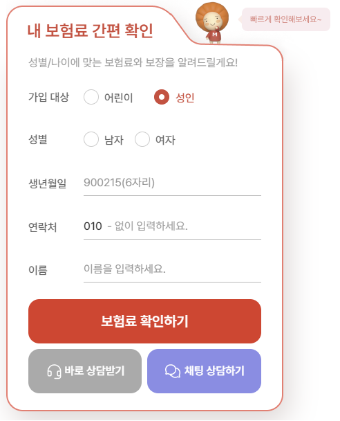 보험료 조회는 가입대상 및 가입대상 정보 입력 후 보험료 확인하기를 클릭합니다.