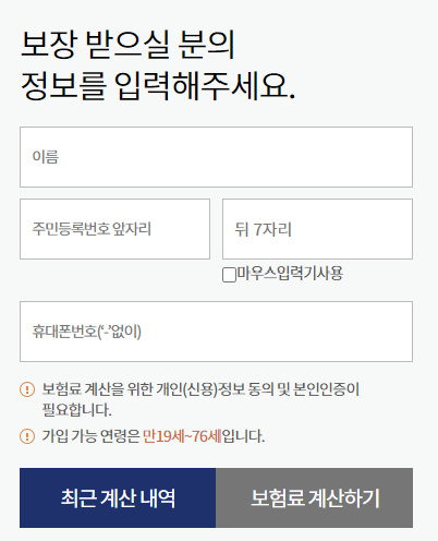 이름 주민번호 휴대폰번호 입력 후 보험료 계산하기를 클릭합니다.