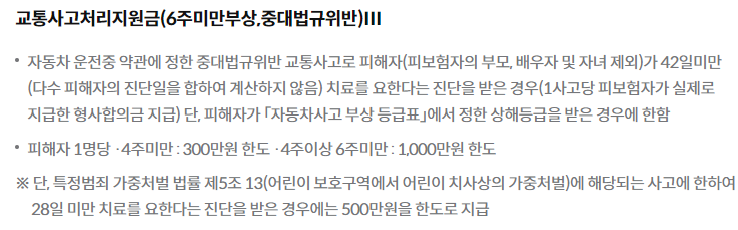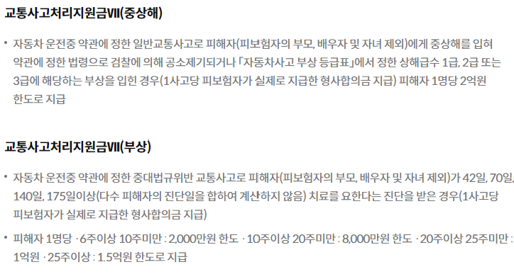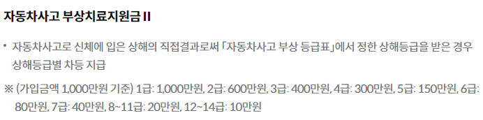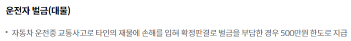 - 주로 운전자가 사고로 다칠 경우 의료비용 및 장해에 대한 보상을 제공합니다.