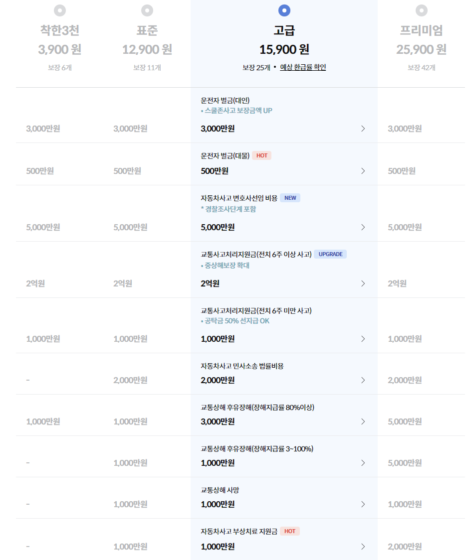 위 보장 외에도 여러 보장내용이 있습니다. 보다 자세한 내용은 약관 및 설명서를 참고 하시거나 보험료 조회 때 보장내용, 보장금액 등을 볼 수 있으니 참고 하시기 바랍니다.