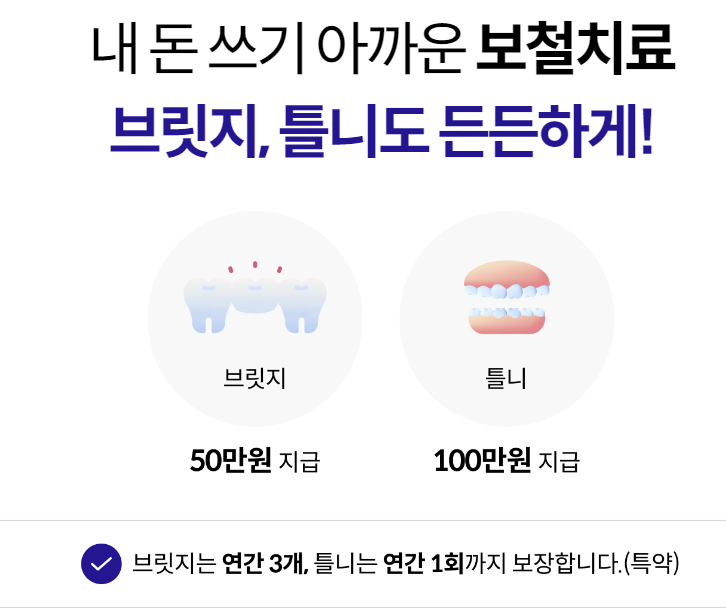 *브릿지/틀니는 보험기간 중 최초로 영구치 발거를 진단 확정받고 해당 영구치를 발거한 부위에 틀니 또는 브릿지 치료 시 보장, 2년 이내 발거 시 50% 보장