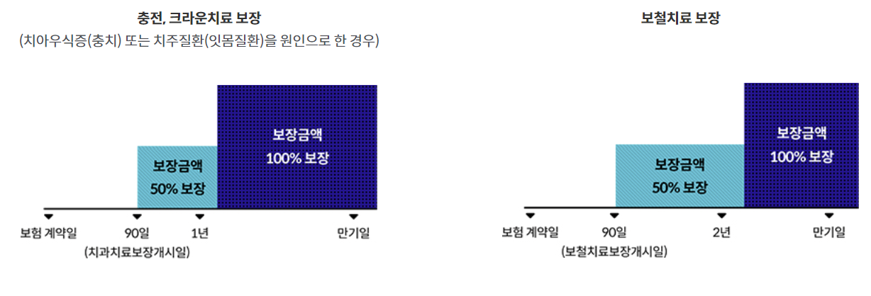 *임플란트의 경우 보험기간 중 치아우식증(충치), 치주질환(잇몸질환) 또는 재해를 직접적인 원인으로 보철치료보장 개시일