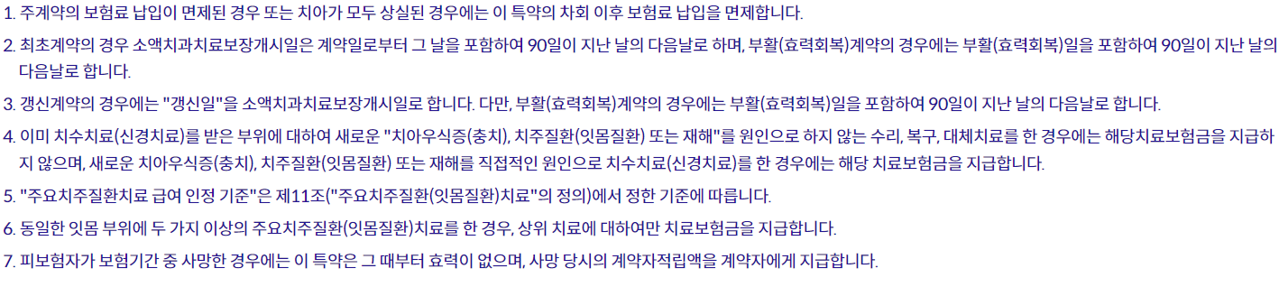 (무)소액치과치료특약(갱신형) 1,000만원 가입 기준, 가입 후 91일부터 보장. 최초로 치주질환(잇몸질환), 또는주요치주질환(잇몸질환)치료를 진단 확정 받고, 의료기관 중 치과에서 국민건강보험법에 정한 요양급여 또는 의료급여법에 정한 의료급여 항목에 해당하는 스케일링, 잇몸질환 치료 시