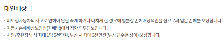 - 운전자보험: 주로 의료 비용, 상해 급여, 일시적인 손상에 대한 일시금, 사망 보상금과 같은 운전자 개인의 손해를 보상합니다.
