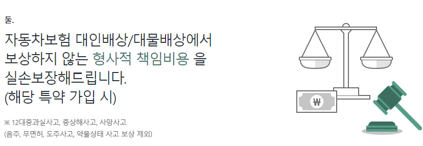 | 자동차사고벌금(대물,실손) | 피보험자가 자동차를 운전하던 중 발생한 자동차사고로 인해 도로교통법 제 151조(벌칙)에 따른 벌금형이 확정된 경우 1사고당 벌금액을 보험가입한도로 지급합니다. |
