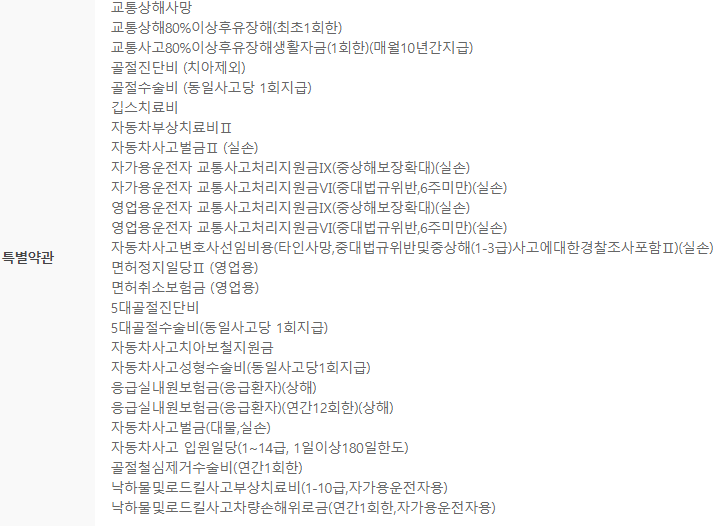 | 낙하물 및 로드킬사고 부상치료비(1-10급, 자가용 운전자용) | 피보험자가 보험기간 중 국내의 도로에서 다른 자동차로부터 낙하된 낙하물 또는 동물(인간을 제외한 포유류 및 조류 동물)과의 직접적인 충돌, 접촉으로 발생한 사고로 신체에 상해를 입고 그 직접결과로써 자동차손해배상보장법시행령에서 정한 부상등급(1~10급)을 받는 경우 가입금액을 지급 * 다른 자동차로부터 낙하된 낙하물 또는 동물(인간을 제외한 포유류 및 조류 동물)과의 충돌, 접촉이 영상기록 및 사진 등으로 확인된 경우에만 보장 |