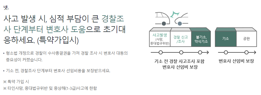 | 자동차사고변호사선임비용(타인사망,중대법규위반및중상해(1-3급)사고에대한경찰조사포함Ⅱ)(실손) | 피보험자가 보험기간 중 자동차 운전중 대인사고로 타인의 신체에 상해를 입혀 아래에 해당하는 사유로 변호사선임비용을 부담한 경우 보상한도액(단, 약관에서 정한 기준에 따름)을 한도로 실제 발생한 변호사선임비용 보상 ①구속 ②검찰에 의한 공소제기(약식기소제외) ③약식기소 후 공판회부 ④약식기소 후 정식재판 청구로 재판이 진행되어 제1심판결이 선고된 경우 ⑤경찰 조사 후 불송치된 경우 ⑥검찰에 의해 약식기소 또는 불기소된 경우 ※ 단, 위 ⑤, ⑥은 타인을 사망하게 한 경우, 중대법규위반 교통사고로 타인의 신체에 상해를 입힌 경우 및 부상등급 1,2,3급에 해당하는 부상을 입힌 경우(중대법규위반 교통사고 제외)에 한함 |