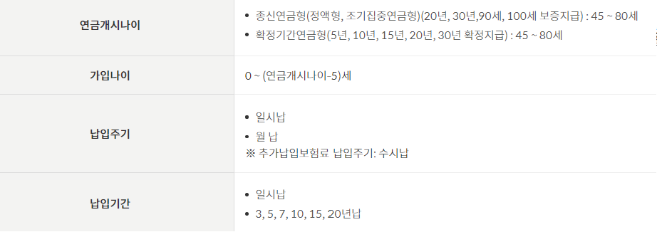 - 종신연금형(정액형, 조기집중연금형)의 경우 제1보험기간 : 보험계약일 ~ 연금개시나이 계약해당일 전일, 제2보험기간 : 연금개시나이 계약해당일 ~ 종신