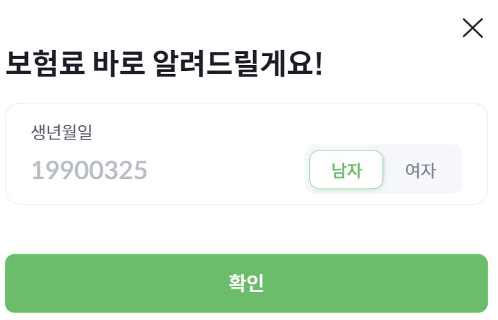 보험료 조회방법은 간단합니다. 생년월일과 성별을 입력하고 확인을 클릭합니다. 그럼 바로 다음과 같이 보험료가 조회됩니다.