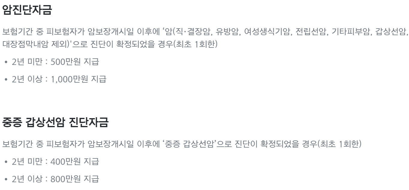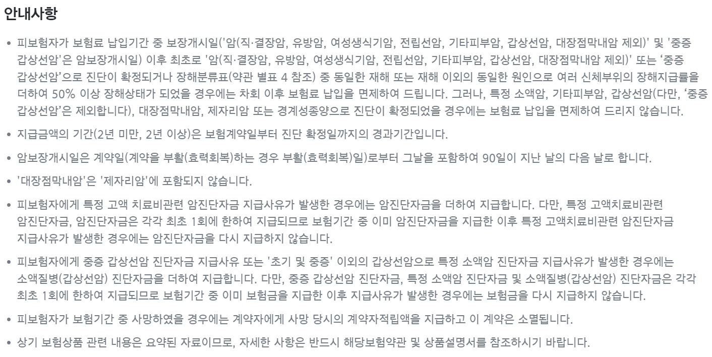 - 특약: 특약은 기본적인 암 진단금 외에 추가로 받을 수 있는 보장 내용입니다. 예를 들어, 수술비, 입원비, 비급여치료비, 표적항암제비, 후유장애금 등이 있습니다. 특약은 별도의 보험료를 내야 하므로, 필요한 특약만 선택하고, 비효율적인 특약은 배제하는 것이 좋습니다.