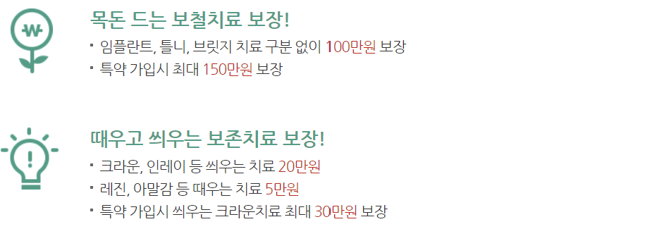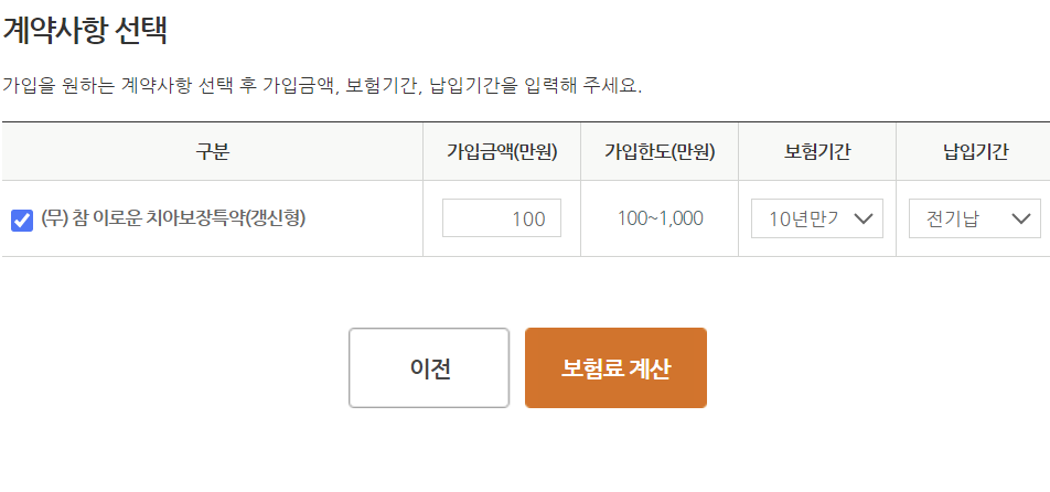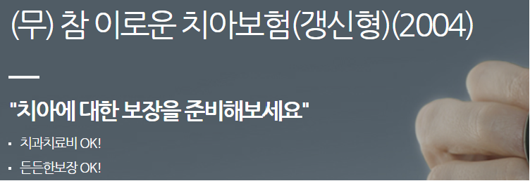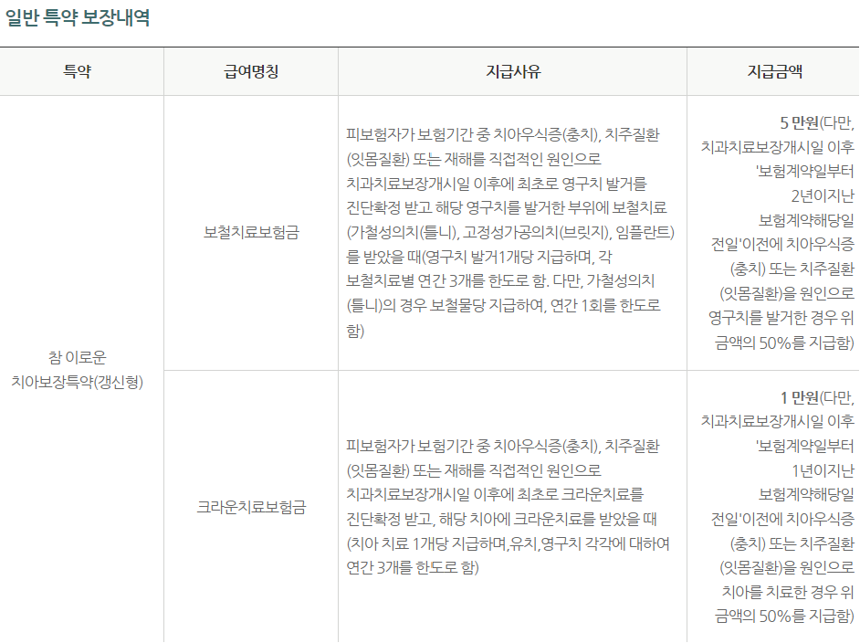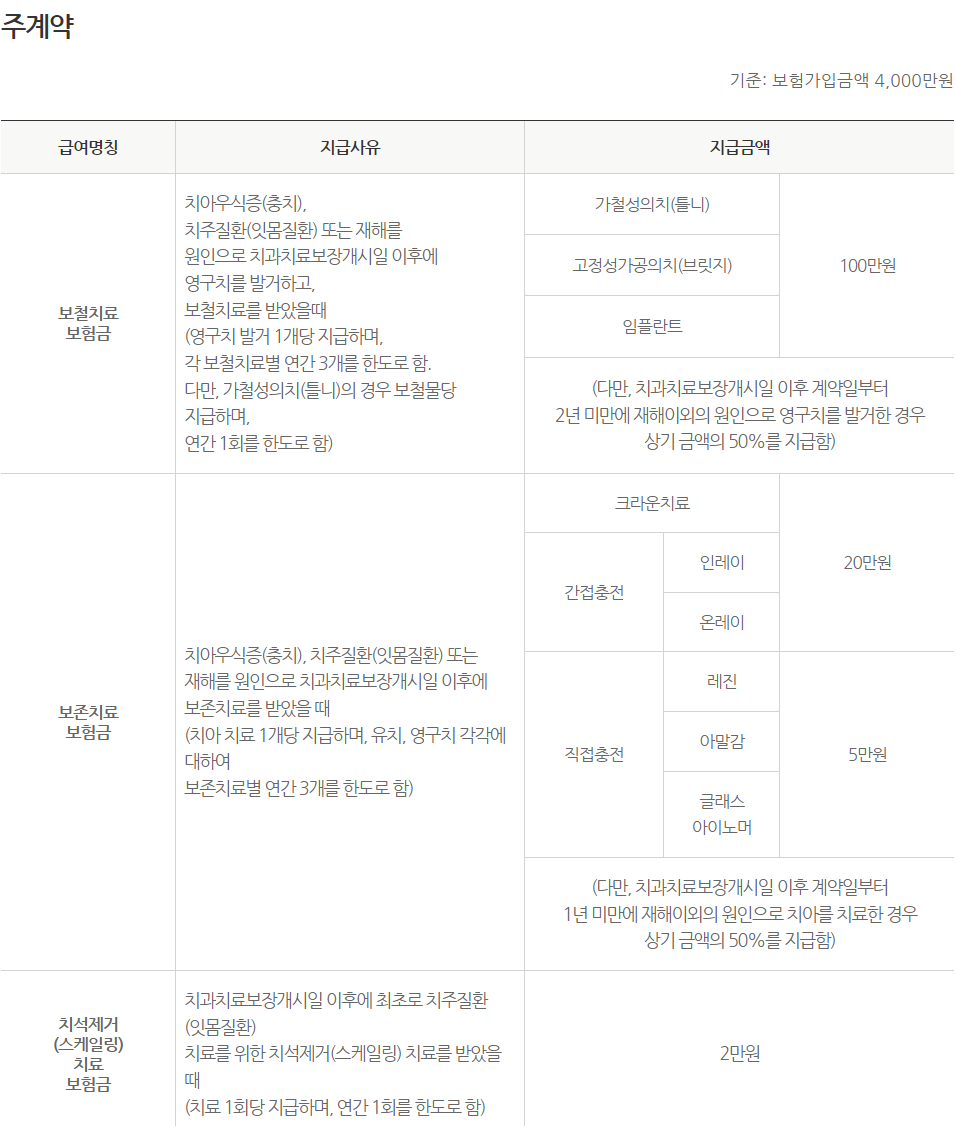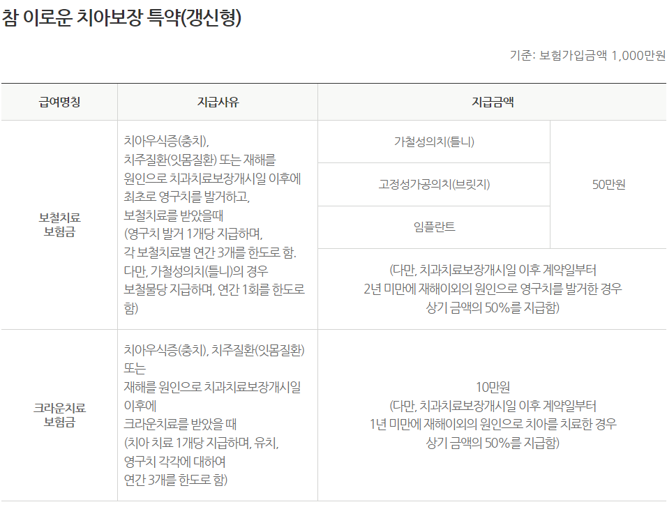 - 기준: 주계약 보험가입금액 4,000만원, 참 이로운 치아보장 특약(갱신형) 보험가입금액 1,000만원