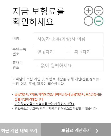 보험료 조회방법은 간단합니다. 이름, 주민등록번호, 휴대폰번호 입력 후 보험료 계산하기를 클릭합니다.