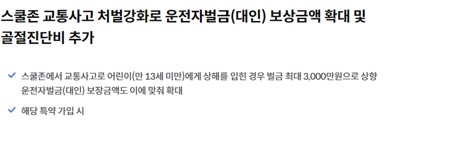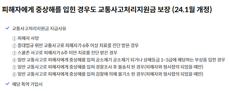 운전자를 위한 3대 비용 든든하게 보장교통사고처리지원금: 피해자에게 지급한 형사합의금을 위한 교통사고처리지원금 보장 (중상해보장 확대 24.1월부터)