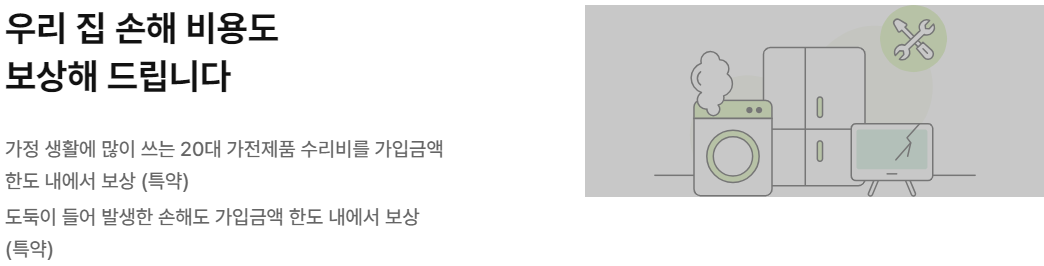 | 20대가전제품 고장수리비용 | 20대 가전제품에 고장 발생 시 실제 수리비를 보험년도마다 가입금액 한도 내로 보상(자기부담금 2만 원) ※ 20대가전제품 : TV, 세탁기, 냉장고, 김치냉장고, 에어컨, 전자레인지, 공기청정기, 청소기, 식기세척기, 의류건조기, 의류관리기, 제습기, 전기밥솥, 정수기, 음식물처리기, 식기건조기, 오븐, 선풍기, 에어프라이어, 전기레인지 |