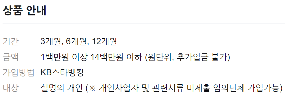 국민은행 대표 정기예금 상품으로 가입기간은 1개월 이상 36개월 이하로 만기일은 월단위로 설정이 가능하며 가입기간별 금리는 아래와 같습니다.