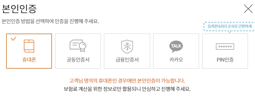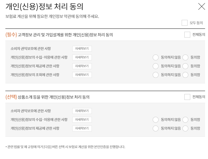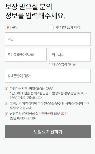 대상 선택 후 이름, 주민번호, 휴대폰 번호 입력 후 보험료 계산하기를 클릭합니다.