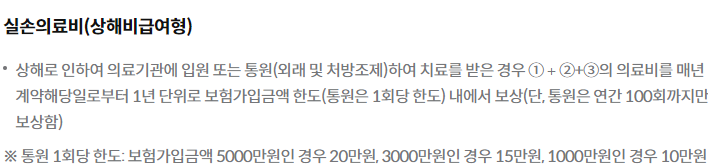 ※ 국민건강보험법 또는 의료급여법을 적용받지 못한 경우(요양급여 또는 의료급여 절차를 거치지 아니한 경우 포함)에는 본인이 실제로 부담한 금액의 40%에 해당하는 금액을 보험가입금액 한도 내에서 보상