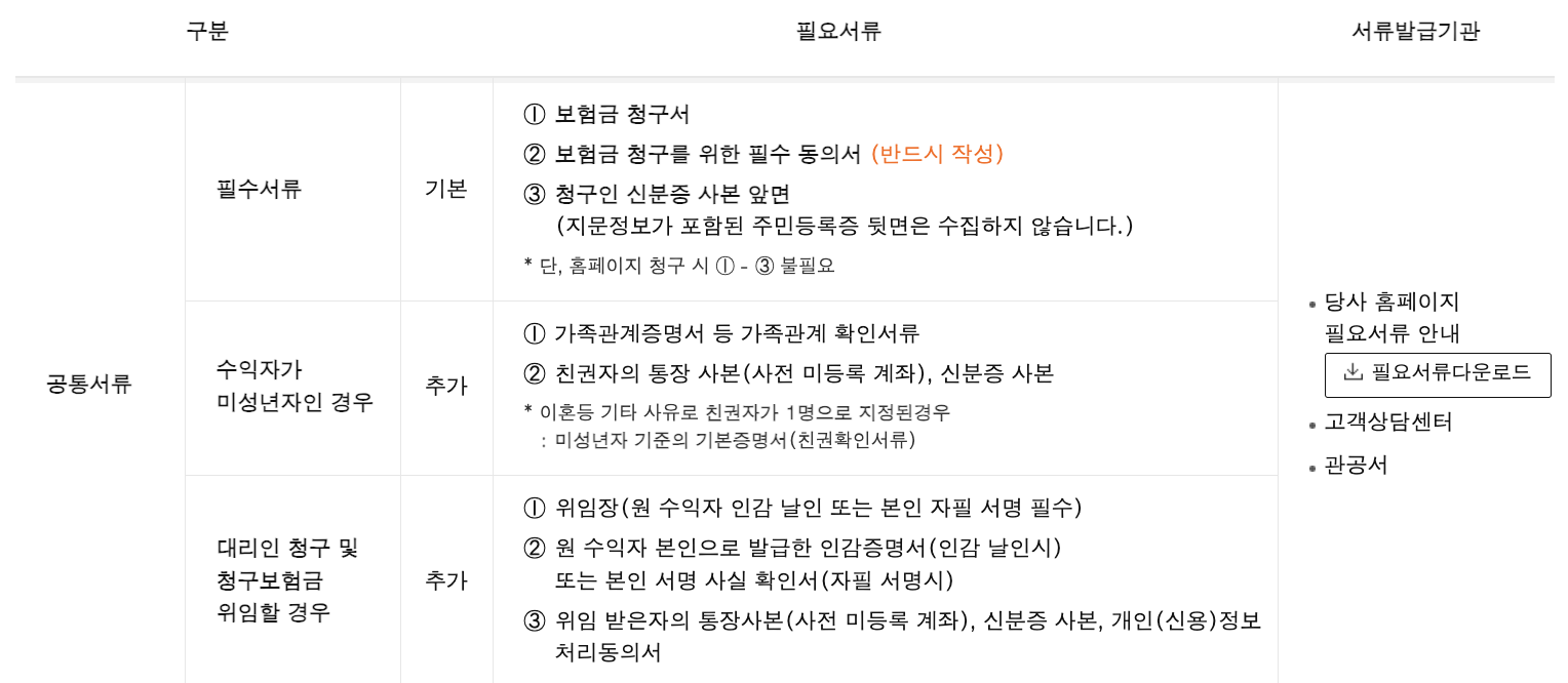 - 우편 청구: 필요 서류를 우편으로 발송하여 청구할 수 있습니다.