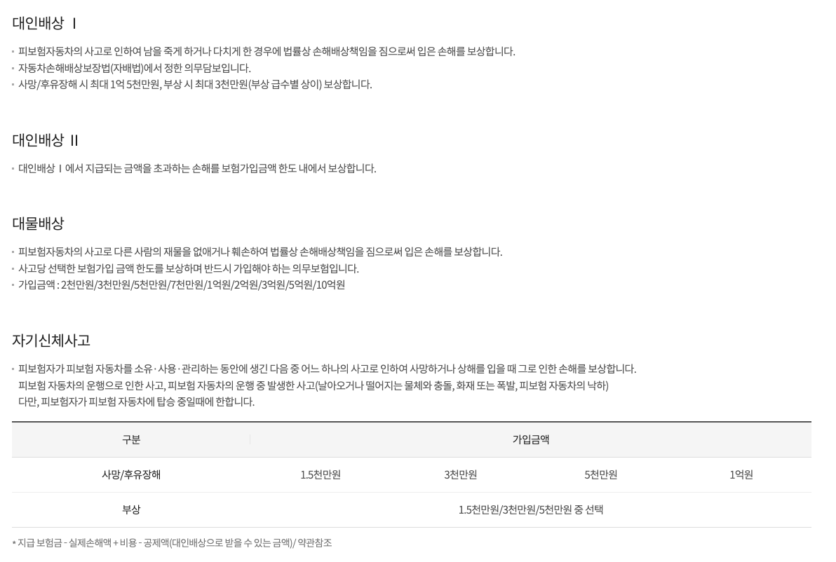 - 대인배상 I: 교통사고로 타인을 다치게 하거나 사망하게 한 경우 법률상 손해배상 책임을 보장합니다. 의무적으로 가입해야 하는 담보입니다.