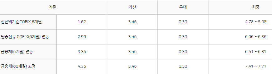 대출금리는 위와 같으며 대출 금리 산정은 기준금리 + 가산금리 - 우대금리를 적용하여 최종금리를 적용합니다.