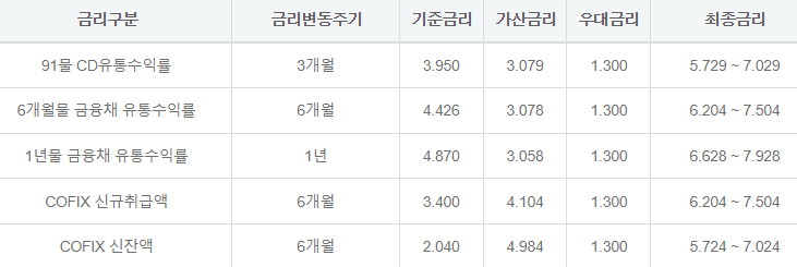 대출 금리는 금리 구분 및 변동주기에 따라 달라지며 기준금리 + 가산금리 - 우대금리를 최종 적용합니다.