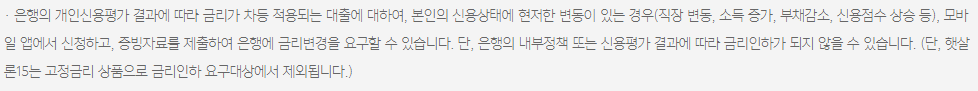 여기서 햇살론15는 금리가 너무 높은거 아니야? 하는 분들이 계실텐데 개인 소득 및 신용이 낮아 제도권 금융이용이 어려운분들을 위해 따로 만든 금융 상품으로 성실상환자(1년간 누적연체 일수 30일 이하)라면 3년 상환 약정 시 1년 마다 금리 3% 인하, 5년 상환 약정 시 1년 마다 금리 1.5% 인하를 해주는 혜택을 주고 있습니다.